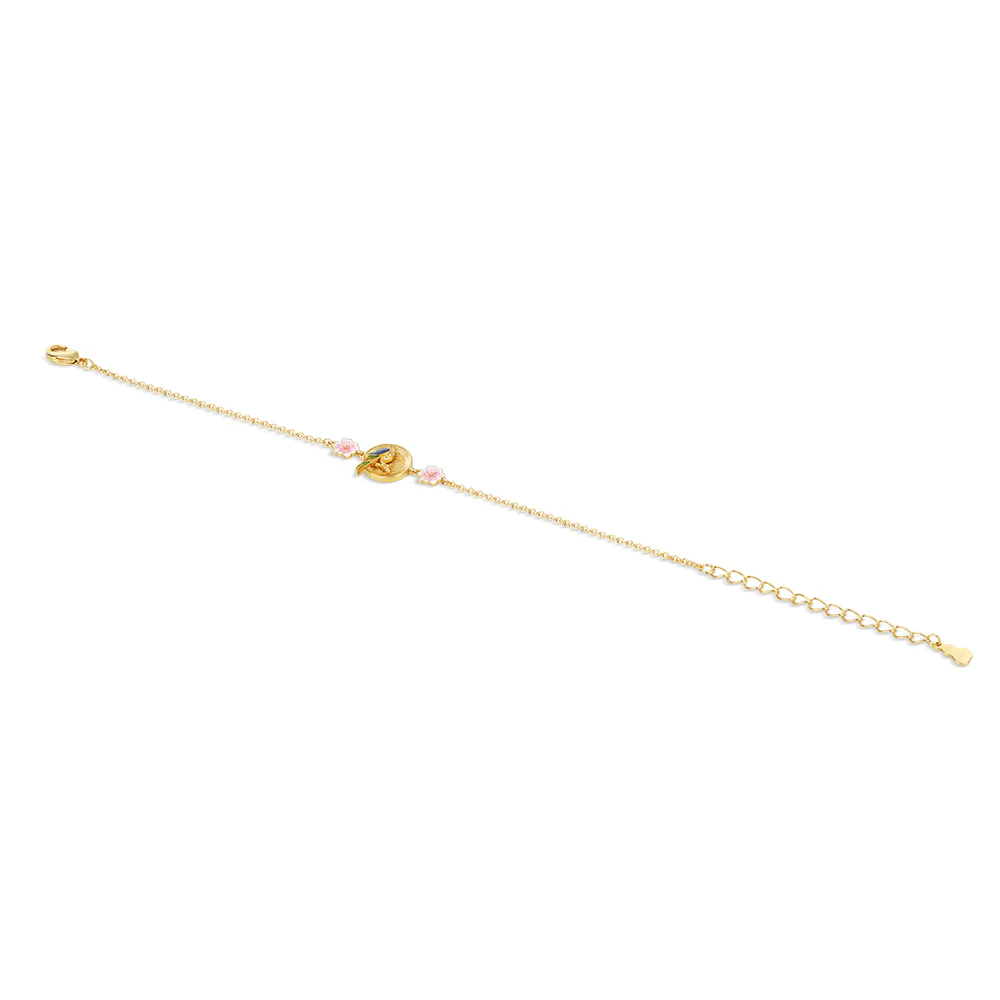 Add a pop of subtle colour to any outfit ensemble with this on trend 14k gold plated floral bracelet from Newbridge Silverware. Its circular design, a timeless symbol of unity emulates a classic feel alongside the beauty of the bird and pink flower detail, a design that is a perfect gift for all occasions.